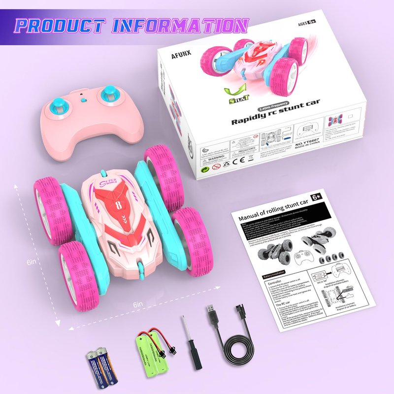 - 360°ROTATING RC STUNT CAR: AFUNX RC stunt car is built for excitement with its ability to perform running, moving forward, backward, turning right, left but also roll and rotate at 360 degrees and drive on double sided flip for different playing experience.Best gift for Birthday and the coming Xmas and New Year.