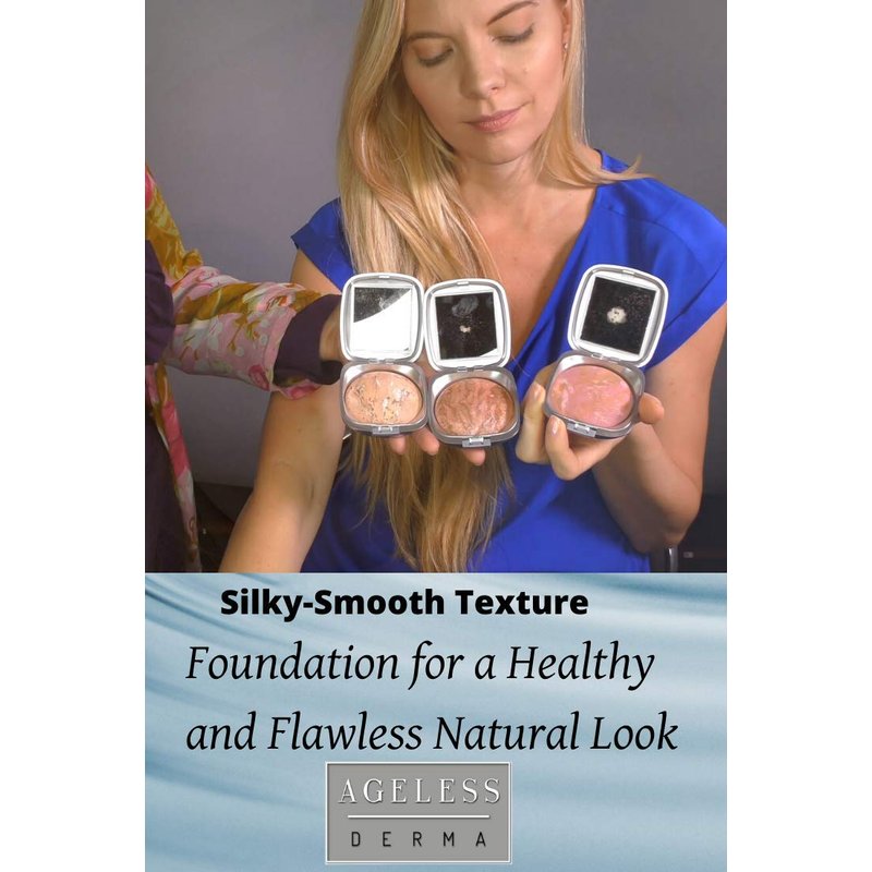 - This light coverage cream to powder foundation is baked and not pressed, it efficiently delivers exceptional color payoff as it blends smoothly on the skin. Ageless derma healthy foundation is Baked for 24 hours in Terracotta tiles in Italy; then hand-finished for no fuss and easy application. Blending perfectly with your skin tone. This baked foundation doesn’t give your skin a powdery and cakey look. It doesn’t set on your fine lines —a perfect choice for aging and mature skin.
