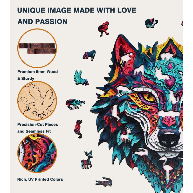 - Unique Shape Puzzles: Unlike traditional rectangular puzzles, with their unique shapes and intricate designs, the wolf puzzles offer a fun and challenging experience for even the most experienced puzzlers.Each piece is so vibrant and sturdy.