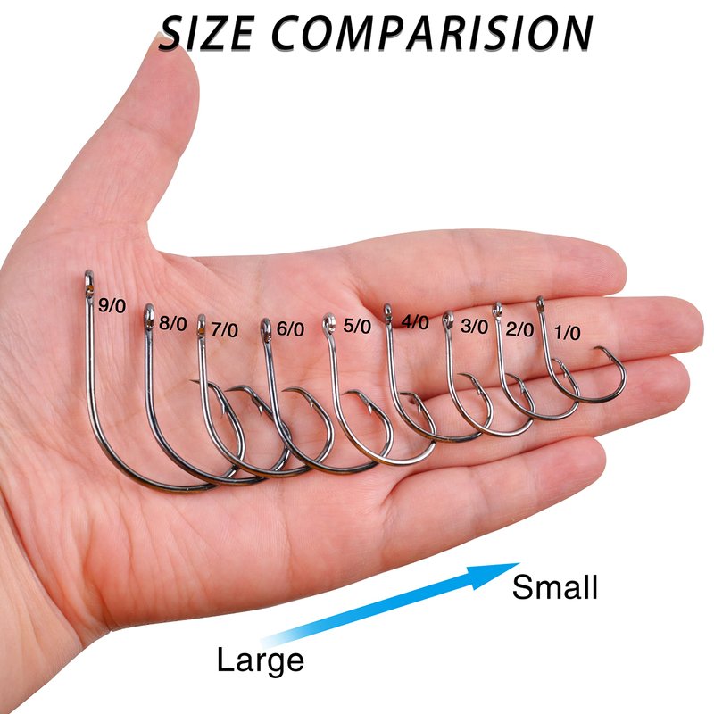 - Quantity: 50/150pcs fishing hooks for each size. Size: 1/0, 2/0, 3/0, 4/0, 5/0, 6/0, 7/0, 8/0, 9/0 you can choose