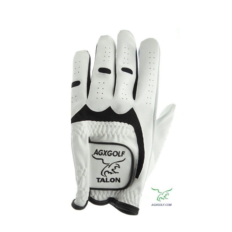 TALON: CABRETTA LEATHER GOLF GLOVES: 12 PACK FOR MEN WHO GOLF RIGHT HANDED (glove fits on the left hand). WE SHIP MOST ORDERS WITHIN 24 HOURS. * The TALON glove is made from Premium Imported "stay-soft" Cabretta leather. * Reinforced with TITANIUM for a STRONGER material with more gripping power (especially in wet weather)! * The TALON glove also features Lycra" inserts as well as Synthetic Laytex Backing for optimum fit and comfort. * The flexible inserts also increases the life of the gloves by minimizing any stretching or tearing of the leather. * Snap On Ball Marker Included with each Glove These are superb gloves. I easily get 10 to 20 rounds from one of these gloves, they grip well and seem to last forever!! PACKAGE OF TWELVE GLOVES! Available in: Small, Medium, Cadet Medium, Medium-Large, Cadet Medium-Large, Large, Cadet Large, X-Large, Cadet X-Large or X-X-LARGE. When in doubt select Large. GET A GRIP ON YOUR GAME!! golf clubs, and more! AGXGOLF, Howell, MI USA