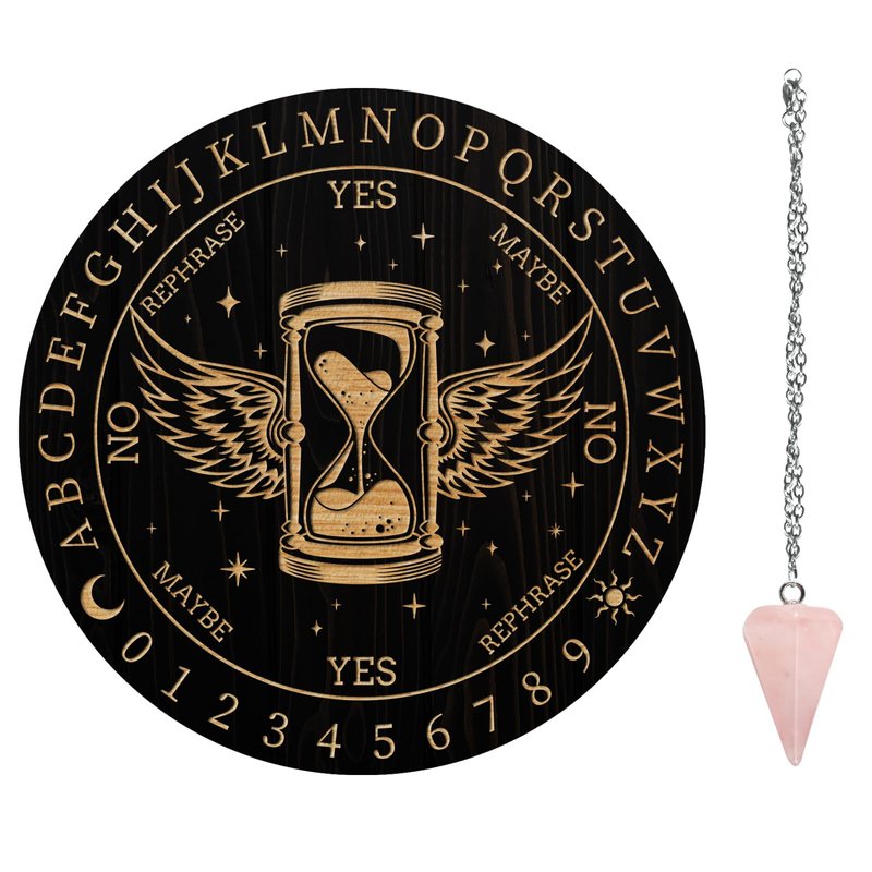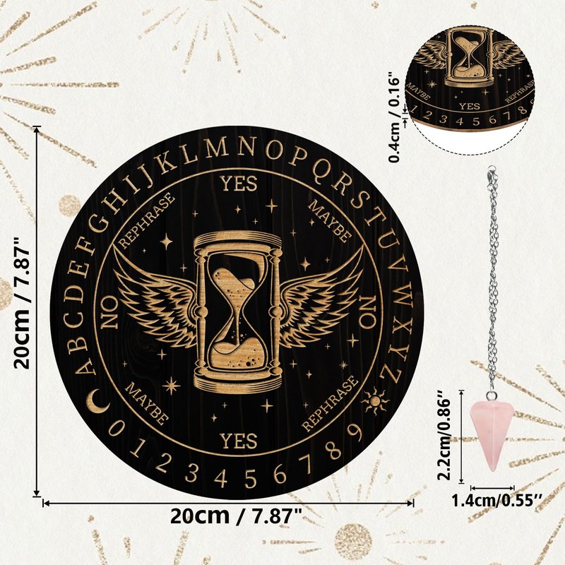 AHANDMAKER Pendulum Board Set, Wooden Dowsing Divination Board Metaphysical Message Board with Crystal Pendulum Necklace for Witchcraft Wiccan Altar Supplies Kit, Hourglass& Wings