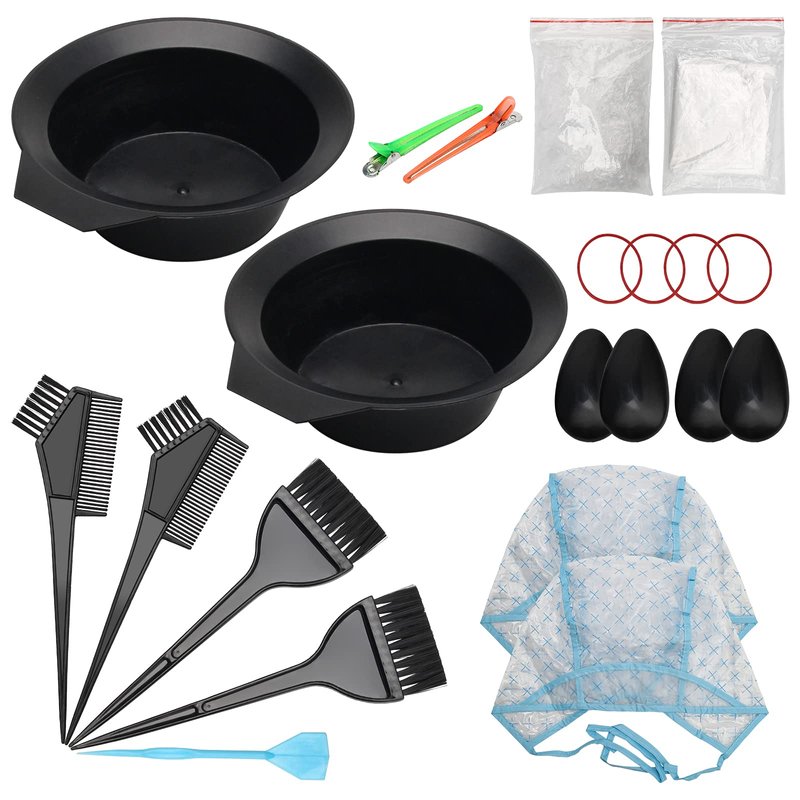 - 【Abundant hair dye kit】-Equipped with 2 x hair tinting bowl, 2 x hair dye comb, 2 x hair coloring brush, 2 x Disposable highlighting cap, 1 x Hook Needle, 2 x hairdressing clips, 2 x disposable shower cap, 4 x colored rubber band, 2 x Disposable shawl, 2 pairs of plastic ear caps, 2 pairs of disposable gloves.