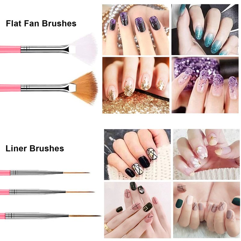 • 【15pcs Nail Art Brushes for Nail Art】 2 Flat Fan Brushes; 1 Angled Head Brush; 1 Pattern Brush; 2 Liner Brushes; 3 Flat Brushes; 3 Oblique Brushes; 1 Dotting Pen Brush; 1 Drawing Brush; 1 Petal Brush.Covers the range of brushes you'll need, different art brushes help you creating beautiful nail patterns easily.