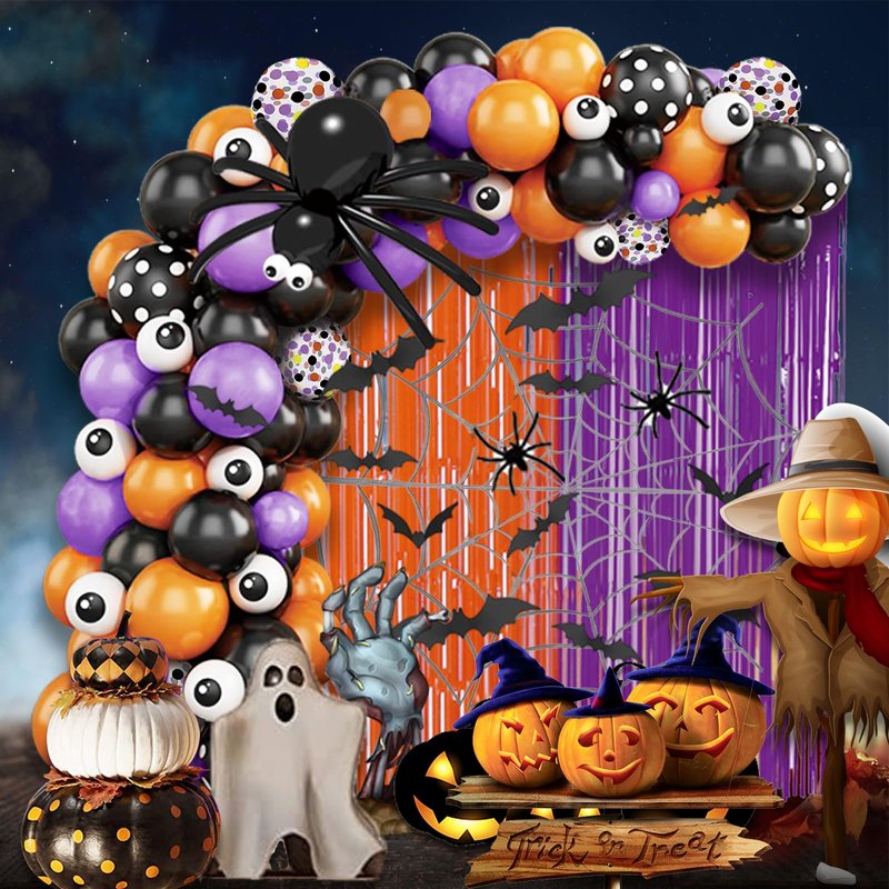 - Halloween party decorations: including 2 18In black balloons, 20 10In black balloons, 10 5In black balloons,25 10In orange balloons,10 5In orange balloons,15 10In purple balloons,15 5In purple balloons,5 12In black and white dot balloons,5 12In white with colorful dot balloons, 20 5In white eye balloons,12 bats,8 black strips balloons,1 spider web,1PCS 3.2x6.5ft Purple Foil Fringe Curtain, 1PCS 3.2x6.5ft Orange Foil Fringe Curtain,1 16ft strip,1 dot glue, and 1 tool
