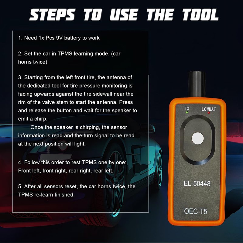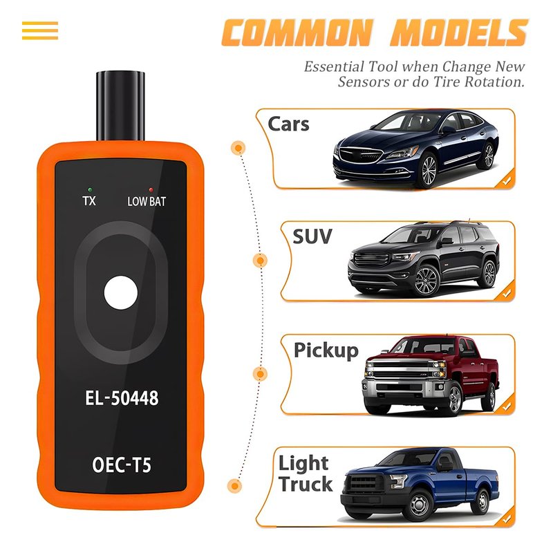 - 【Vehicle Universal】: Our activation tool is universal for most cars on the market, such as sedan, SUV, pickup truck, etc., not for large trucks. EL-50448 fits Enclave, Encore, LaCrosse, Regal, Camaro, Corvette, Traverse, Malibu. Please carefully identify the proper fit for your vehicle. (Different vehicles may take different amounts of time to reset all tire sensors after rotation.)
