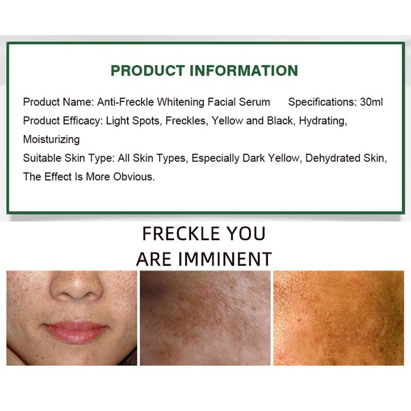 Enriched with ingredients and multiple plant extracts to solve the skin problems such as chloasma , freckles , sun spots and dull skin in a safe and effective way , leaving the skin long - lastingly moisturized , smooth and delicate . Usage : After facial cleansing , apply proper amount of this product evenly to the face until absorption Properly apply more to the severely spotty areas . Long - term use is advisable . Attention : For people with skin allergies , do a 48 - hour patch test on the inner side of the arm or the skin behind the ears before use . Ingredients : Caprylic / Capric Triglyceride , Vitis Vinifera ( Grape ) Seed Oil , Niacinamide , Triticum Vulgare (Wheat ) Germ Oil , Rosa Rugosa Flower Oil , Pelargonium Graveolens Oil , Camellia Sinensis Extract , Citrus Limon (Lemon ) Seed Oil , Tocopherol .