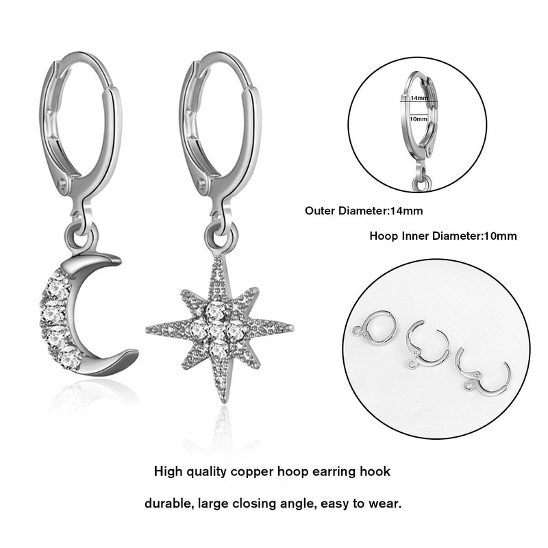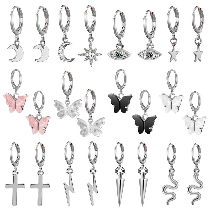 - Hoop Earrings Sets - Small dangle hoop earrings with multiple charms, silver star and moon, butterfly, evil eye, cone spike, snake, cross, lightning, make you more charming and elegance