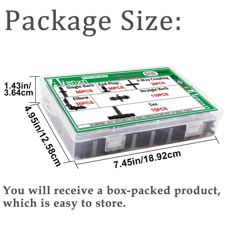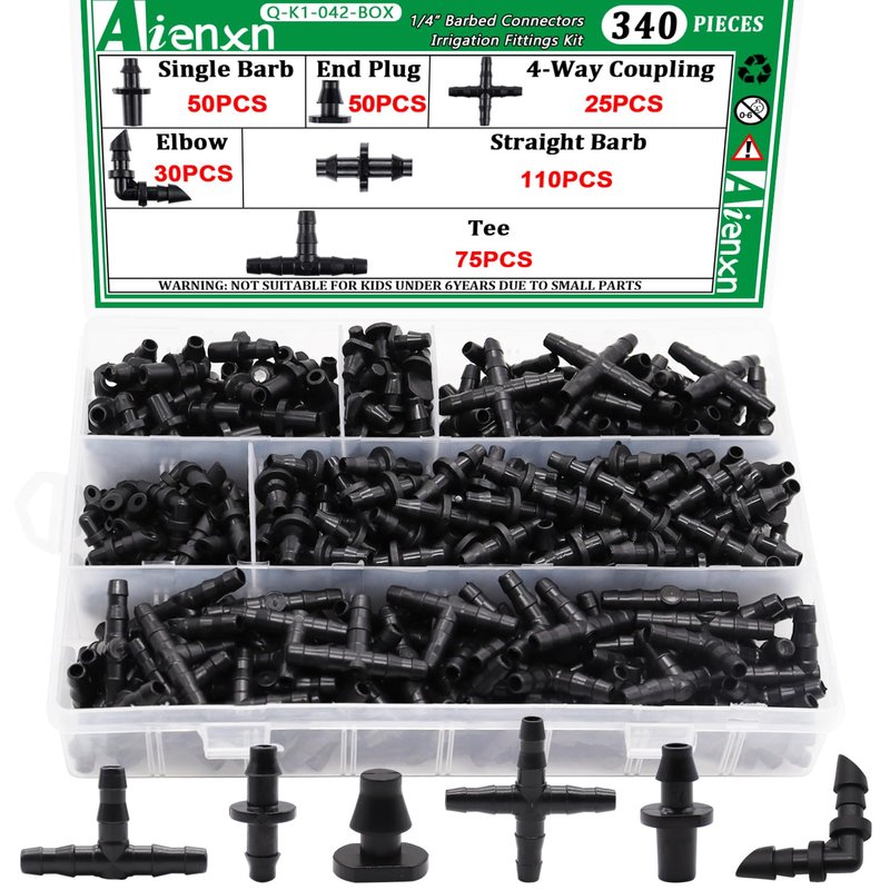 Aienxn 340PCS 1/4" Drip Irrigation Kit Barbed Connectors, Straight Barb, Tee, Single Barb, End Plug, Elbow, 4 Way Coupling Irrigation Fittings for Garden Lawn Flower Pot Q-K1-042-BOX