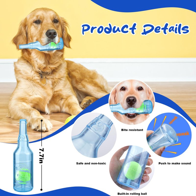 - Stimulate Your Dog's Curiosity: Equipped with a squeaker at the tail and an internal moving tennis ball, this dog toy water bottle makes a squeaking sound when chewed by dogs. This sound serves as a stimulant and source of entertainment for dogs, igniting their innate curiosity and exploratory instincts. The water bottle dog toy is ideally suited for puppies, medium-sized dogs