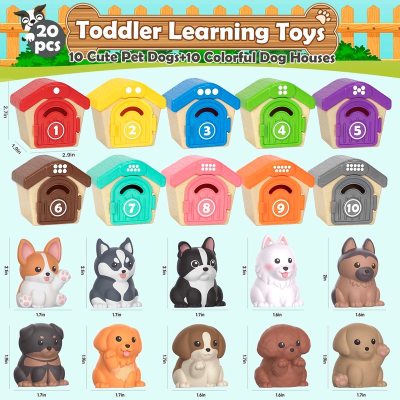 - Montessori Learning Toys: Dog house doors have numbers from 1 to 10 printed on it, and the roofs have dots corresponding to the numbers. Babies can have fun number learning and color matching sorting games based on these,exercise their counting,color recognition,classification and matching skills. Best toddler sensory develepment toys, let our cute puppies accompany your kids through childhood!