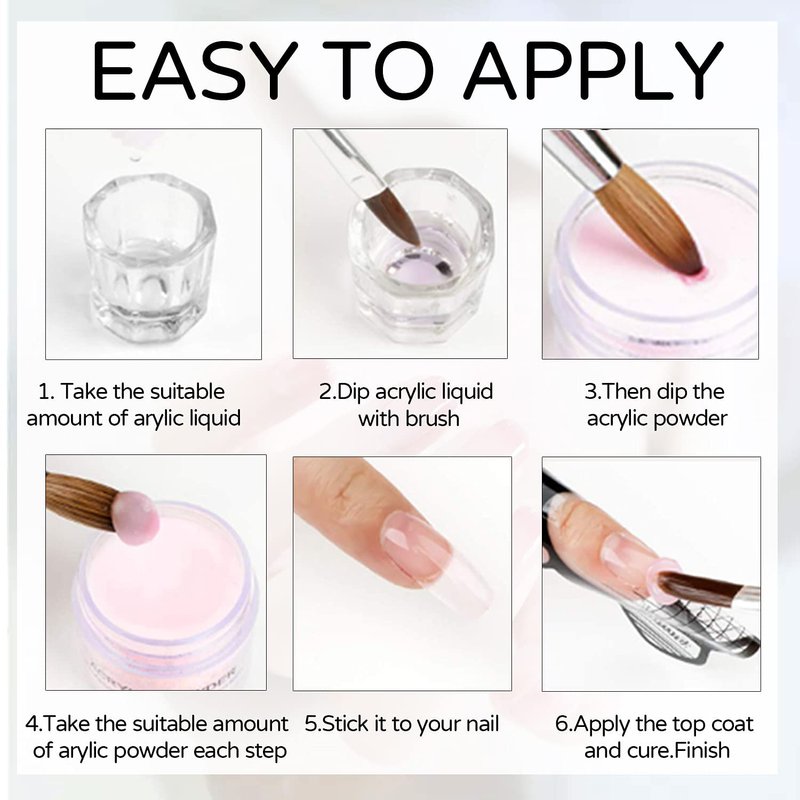 - ACRYLIC NAIL KIT APPLICATION: When using monomer acrylic nail liquid, Just mix the acrylic powder and acrylic liquid into the dappen dish, Use acrylic nail brush apply onto your real nail / nail forms. Acrylic nail kit for beginners you can use this acrylic nail kit to diy, Nail extension, adhesive gel, nail carving and etc.