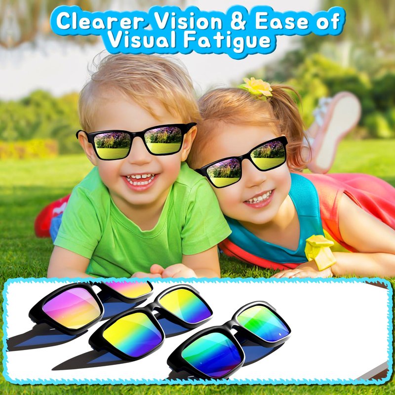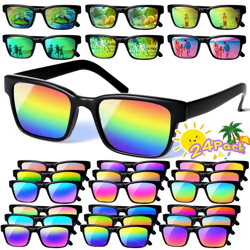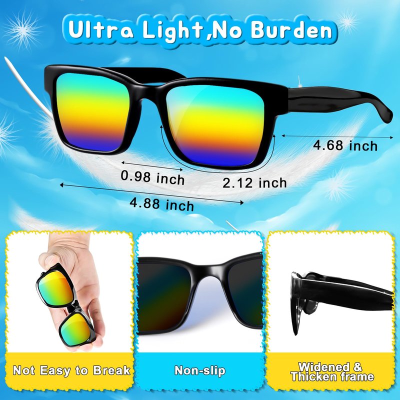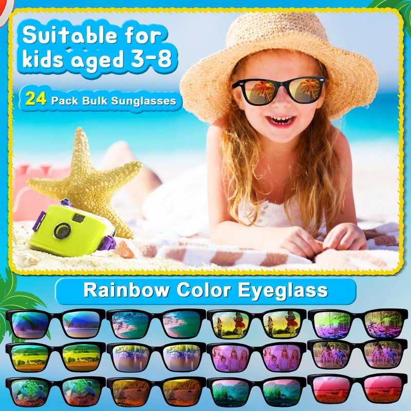 - Bulk Sunglasses Party Favors - Includes 24 packs of rainbow-colored sunglasses, made of soft premium materials,adopt high-quality plastic lenses. The lightweight frame makes it almost imperceptible to toddlers, this kid sunglasses also won't cause any stress or discomfort to the glasses or nose bridge for long-time wearing. 4-8 years old Boy and Girl both are suitable.