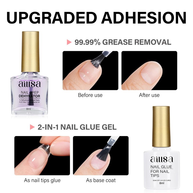 - DUAL PROTETION FOR “ADHESION”: For better adhesion, our gel tips nail kit includes a Nail Prep Dehydrator and a Nail Glue. The former can clean the nail surface and remove any oil or debris that can weaken the bonding between adhesive and nail. The latter is made of natural resin material with strong adhesion. Dual protection to ensure adhesion for your nails, prolonging the longevity of your nail design. Moreover, our nail glue can be used as base coat, buy one get two, so worthy