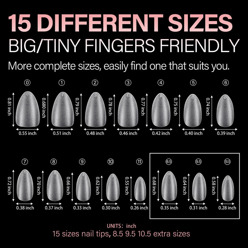 - MULTIPLE SIZE OPTIONS - Including 15 different sizes with each size 16pcs, totally 240pcs, our fake nail tips can provide you with more options. And there are numbers “ 0-14” marked on the fingertips, you can quickly find you sizes. The false nail tips are easy to operate, suitable for professional manicurist and even beginner. On weekends, you can invite some friends to DIY nail art at home together, which can save money and enhance relationship.