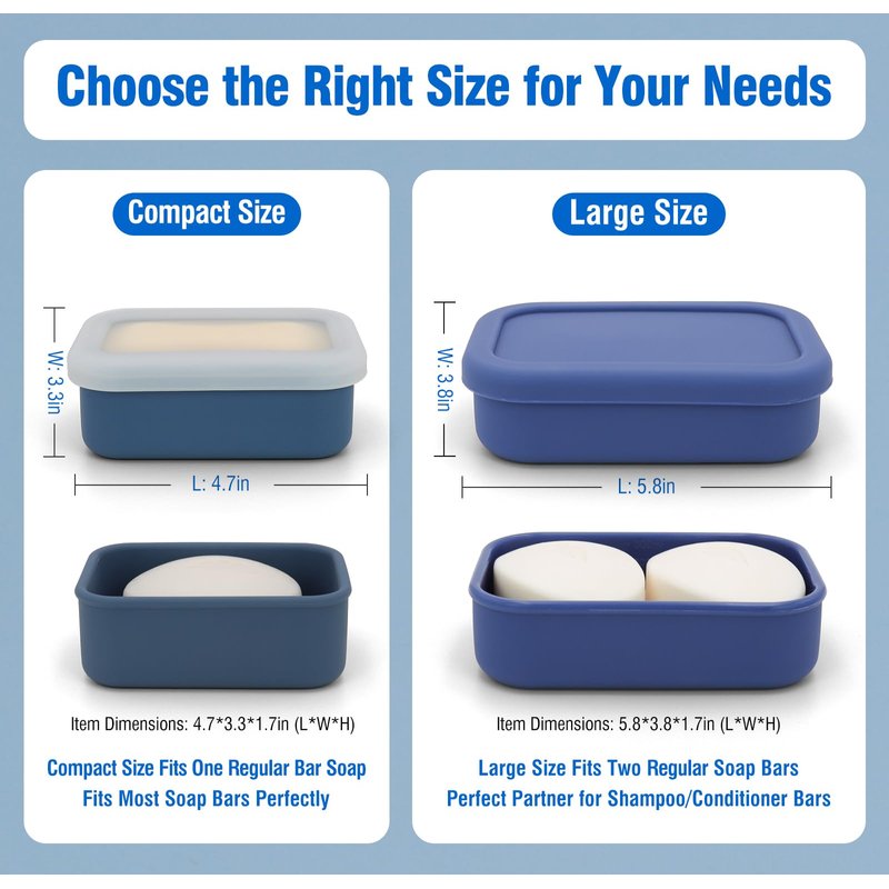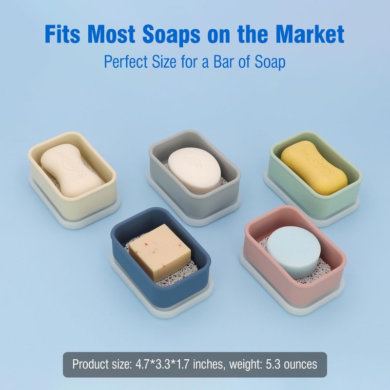 Travel in confidence with our silicone soap travel case, engineered with a leak-proof silicone lid for ultimate protection. Your bar of soap stays 100% dry and secure, even when immersed or stored in tight spaces. Measuring a compact 4.8*3.3*1.7 inches, this travel bar soap case is the perfect size for any bag or suitcase, ideal for TSA compliance and a must-have for dorms, gyms, and outdoor adventures. Our soap bar travel case features a 0.3-inch drainage layer that keeps your soap elevated, dry, and ready for use. The lid's semi-transparency allows for easy soap level checks, while the high-quality silicone construction ensures durability and a comfortable grip, surpassing plastic alternatives. Ideal as a shampoo bar travel case or for any solid beauty bars, this enhanced leak proof travel soap case is a practical and thoughtful gift for the frequent traveler. Its portability and functionality make it the go-to accessory for business trips or leisure excursions. Elevate your travel routine with our bar of soap travel case – a compact, durable, and stylish solution for all your on-the-go hygiene needs.