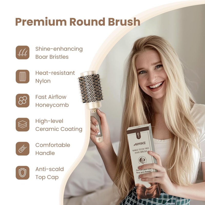 AIMIKE Hair Brush Set, Nano Thermal Ceramic & Ionic Tech Round Barrel Brush with Boar Bristles for Blow Drying, Enhance Texture for Styling, Curling and Shine, Includes 1 Tail Comb + 4 Hair Clips