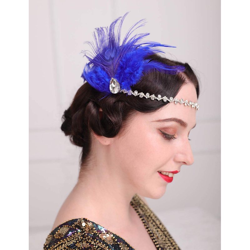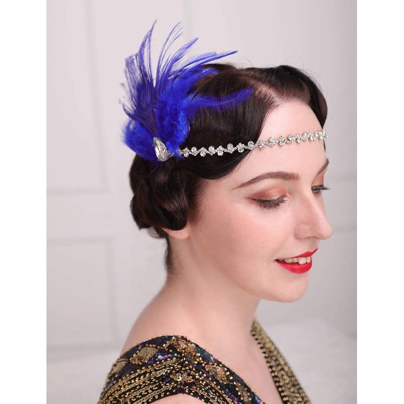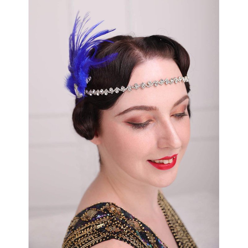 Aimimier Bridal 1920s Flapper Feather Headband Royal Blue Feather Hair Clip with Crystal Head Chain Roaring 20s Headpiece Accessories for Women and Girls