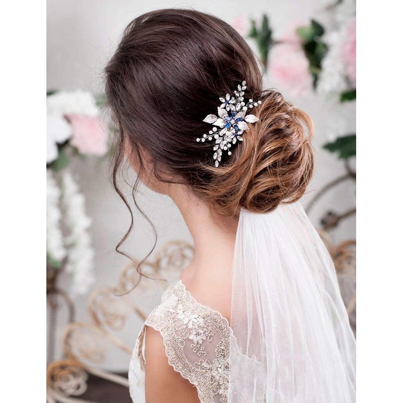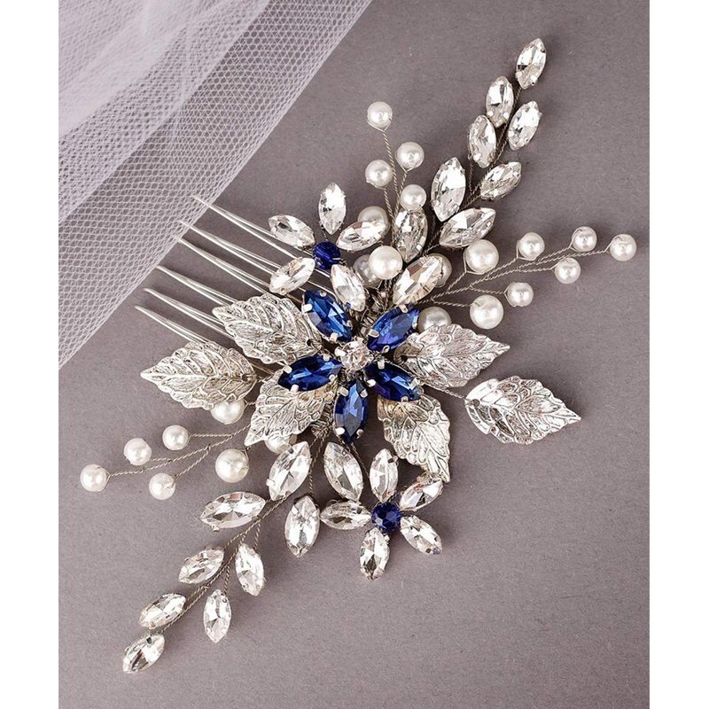 Aimimier Bridal Sapphire Crystal Hair Comb Pearl Blue Crystal Leaf Marquise Hair Piece Prom Party Festival Wedding Hair Accessories for Women and Girls (Silver)