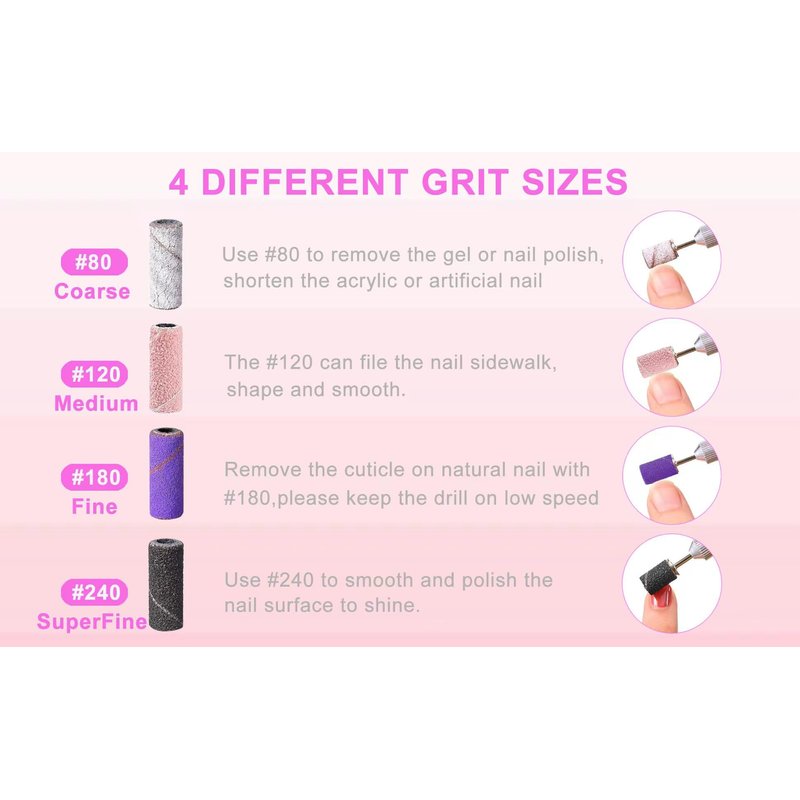 - 【Various Grit Options】#80 remove the gel overlays or shorten the acrylic or artificial nails easily.120# helps you to prep the nail quickly, file the nail sidewalk, shape, and smooth. 180# comes with a smooth surface and it will perfect on the natural nail and cuticle with your file's low speed. 240# helps you smooth and polish your nail surface to shine.