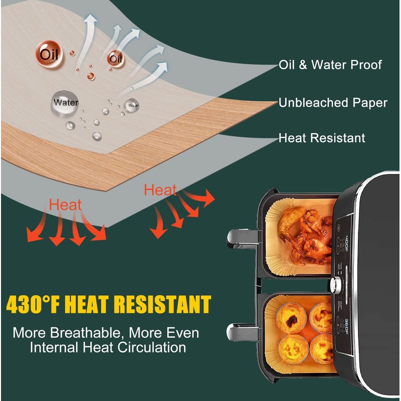 - Healthy Material: The air fryer disposable paper liner is made from 100% food-safe parchment paper that is oilproof, waterproof, non-stick and heat resistant. It can withstand temperatures of up to 428℉ while retaining the flavor of the food. We pay more attention to the health and hygiene of the materials.