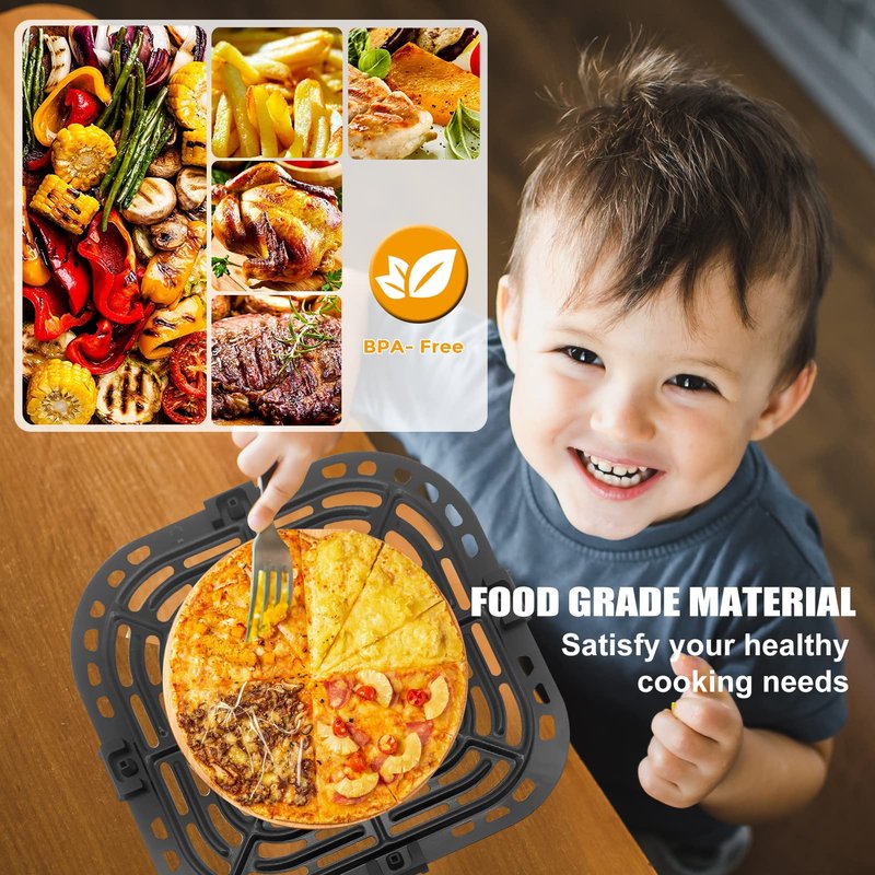 - 【Exquisite Design】: The Air Fryer Replacement Tray features airflow design, food is more evenly heated and delicious. It easy to take off from frying basket and wash in dishwasher by the handle in middle. 4 Rubber Bumpers can protect the inner wall of air fryer from scratches effectively.