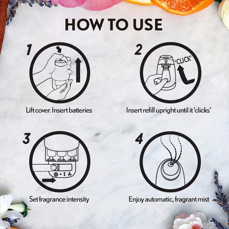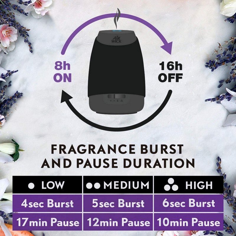 - Your fragrance experience: Device does not mist continuously, 5 different settings to adjust fragrance intensity (length of spray and frequency)