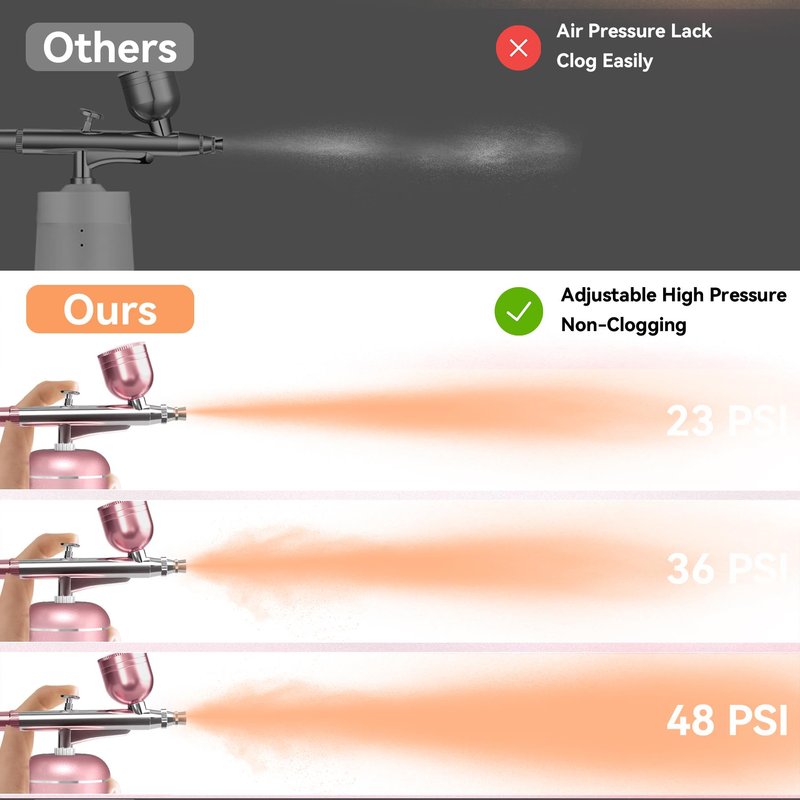 - 𝐇𝐢𝐠𝐡𝐞𝐫 𝐚𝐧𝐝 𝐀𝐝𝐣𝐮𝐬𝐭𝐚𝐛𝐥𝐞 𝟑-𝐆𝐞𝐚𝐫 𝐀𝐢𝐫 𝐏𝐫𝐞𝐬𝐬𝐮𝐫𝐞:Experience superior control with our upgraded airbrush, offering 3 adjustable air pressure settings (23psi, 36psi, and 48psi). Achieve your desired effect effortlessly without clogging, making it perfect for model painting, graffiti, manicures, makeup, barbering, cake decorating, and tattoos.