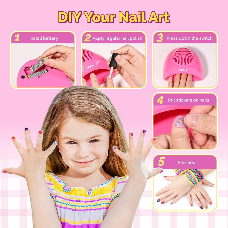 - Designed for Kids, Ages 5+: The AIRSEE Nail Dryer is perfectly sized for little hands and safely designed for kids! It features a gentle fan that dries nails quickly without UV/LED light, eliminating risks of burns or skin damage. Comes with fun DIY nail stickers to spark creativity. The AIRSEE Nail Dryer ensures safety while allowing children to fully express their love for beauty, improve focus, and grow as young nail artists.