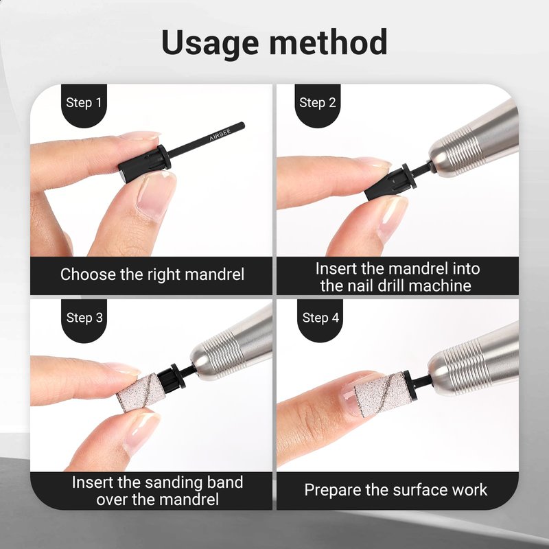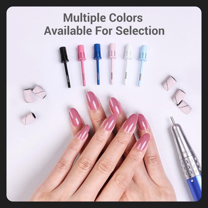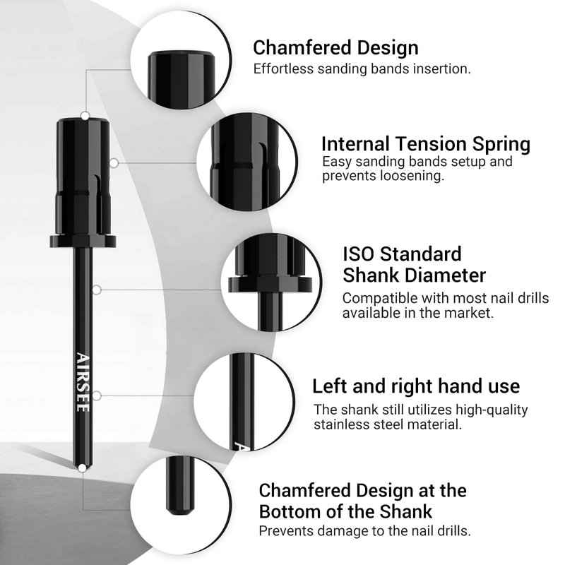 - [INNOVATIVE DESIGN] Equipped with an internal tension spring design for easy sanding bands installation, ensuring they won't loosen or fall off, guaranteeing precision and safety during the manicure process. The chamfered top facilitates edge polishing, while the chamfered shank bottom prevents damage to the nail drills.