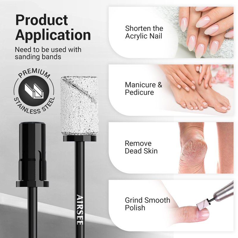 AIRSEE Nail Drill Mandrel Bit for Efile Sanding Bands, Stainless Steel Professional Electric File Head for Clean Cuticle Removing, Acrylic Tip Dead Skin Sander Remover Manicure Safety (Classic Black)