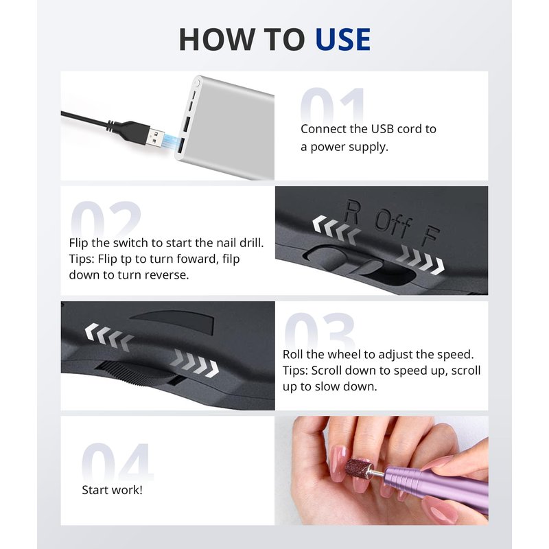 - USB-Powered Flexibility – Enjoy the convenience of flexible charging with a USB cable and the option to go cordless when paired with a portable power bank, ensuring your nail drill is ready to use anytime, anywhere.