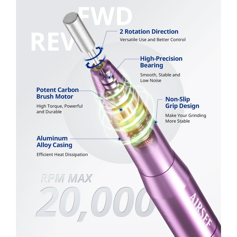 - High-Speed Versatility – With a maximum speed of 20,000 RPM, the AIRSEE N14 meets all your nail needs, from shaping to buffing to polishing. Dual-direction rotation enhances ease of use for both right and left-handed individuals, offering better precision and control.