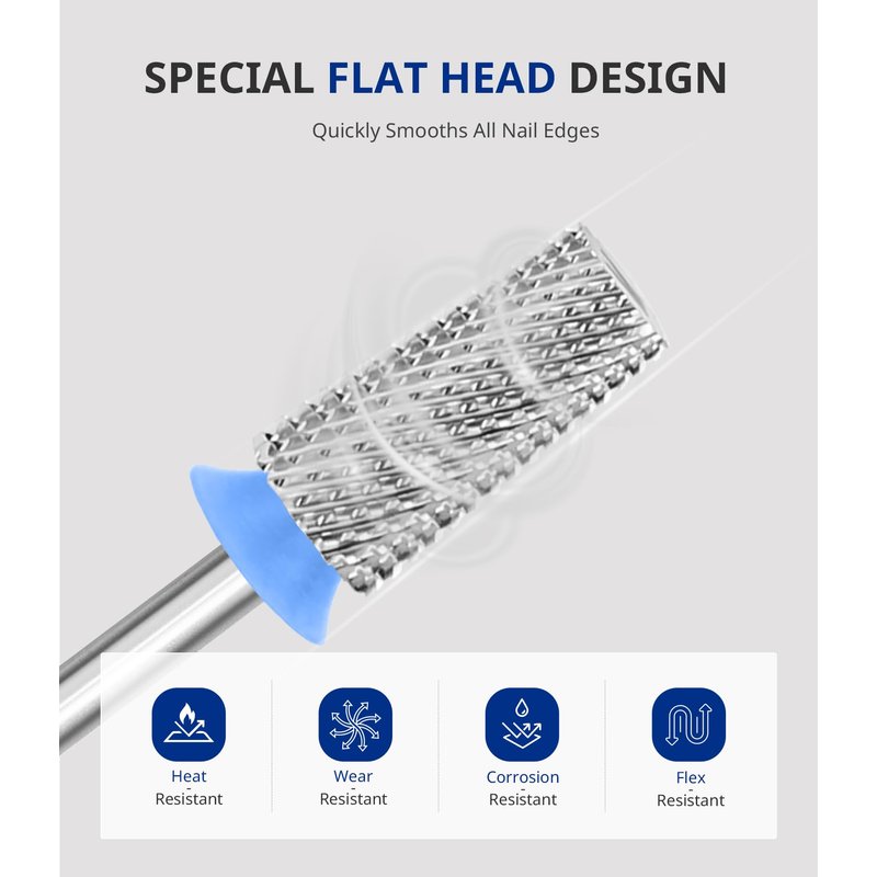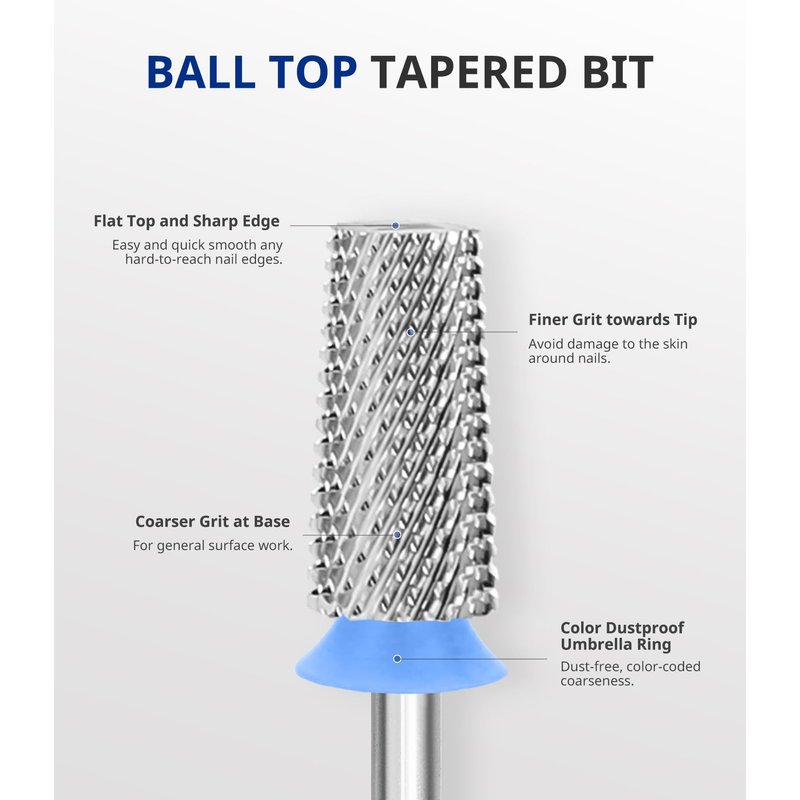 - Shape: Flat Top Tapered Barrel; The tapered shape nail drill bit includes a finer grit at the tip of the bit to avoid any damage to cuticles and surrounding nail walls and a coarser grit towards the base of the bit for faster nail bed surface work