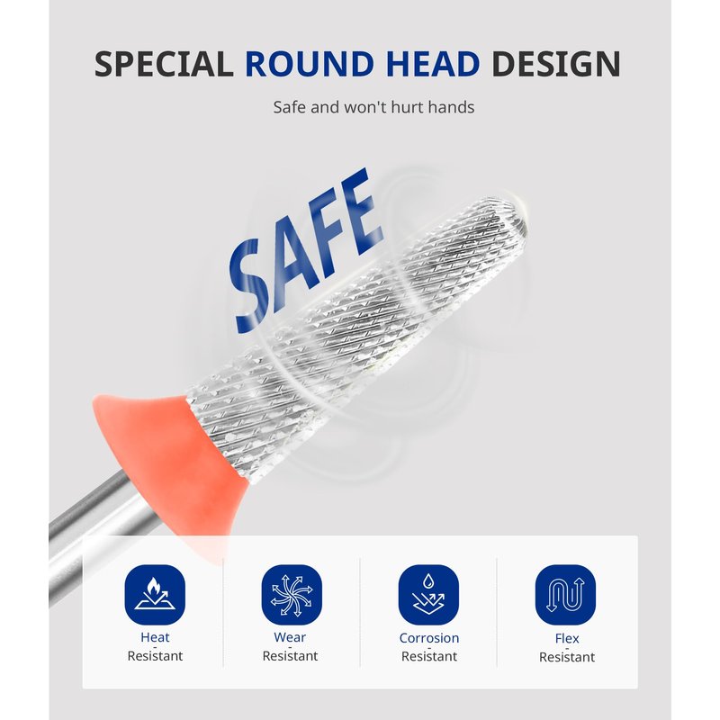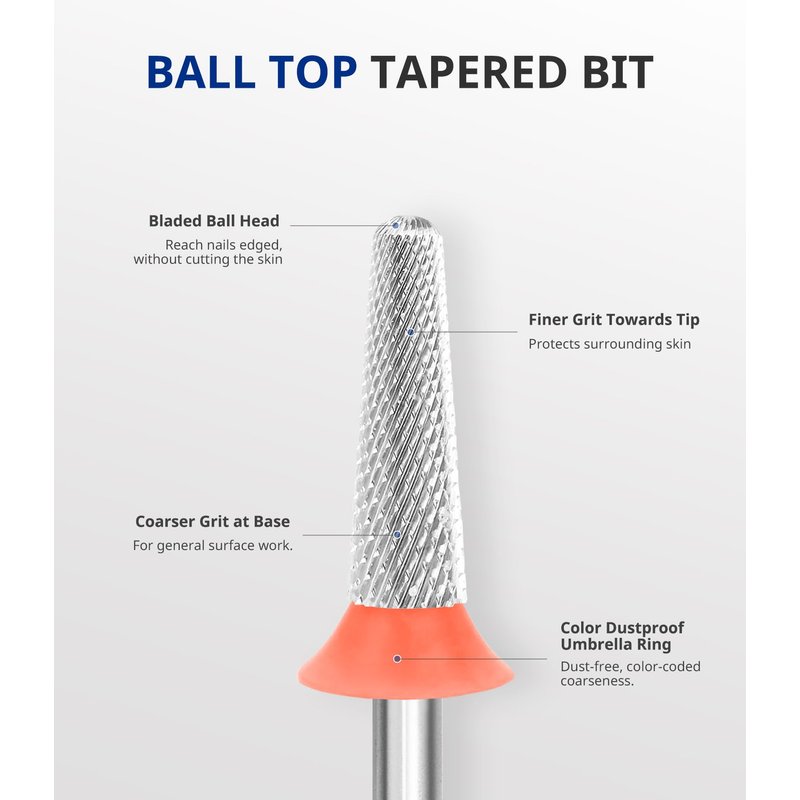 - [Shape] Ball Top Tapered Bit: The drill bit is rounded at the top with the tapered shape body to protect the cuticles and side walls from scratches and cuts upon contact.