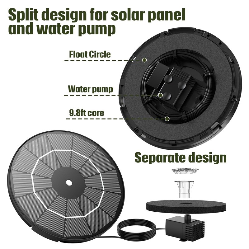 - 【Multi-use Scenarios】This solar water fountain pump kit with a separate design, you are free to design into a water feature or other water circulation system, so that your garden looks lively. With a 9.8ft cord connecting the water pump to the solar panel, you can place your water feature and fish tank in the shade or indoors and simply expose the solar panel to the sun.