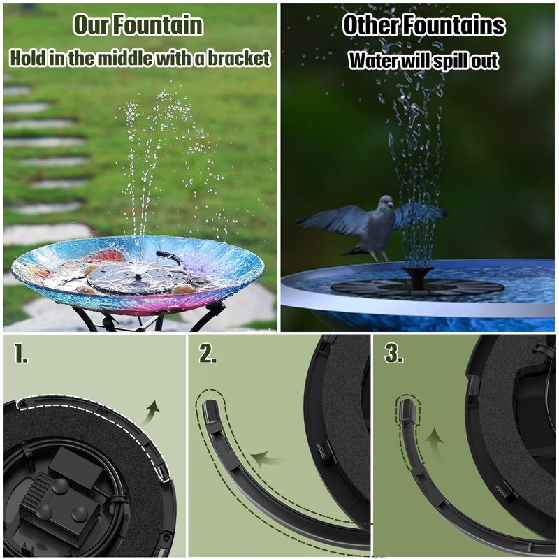 - 【Retractable Bracket Design】The solar bird bath fountain is equipped with a retractable stand designed for bird baths. The bracket keeps the fountain secured in the center of the bird bath to prevent the spray from splashing out.