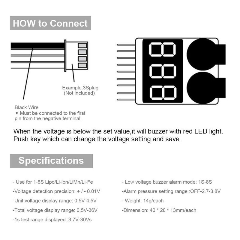 This product is suitable for various kinds of RC battery, When the voltage is below the set value, it will buzzer with red LED light,The alarm voltage can be set by pressing the button on top of the unit. The voltage the alarm will sound is adjustable between individual cell voltages of 2.7v and 3.8v in .1v increments ,pre-set value 3.3V.