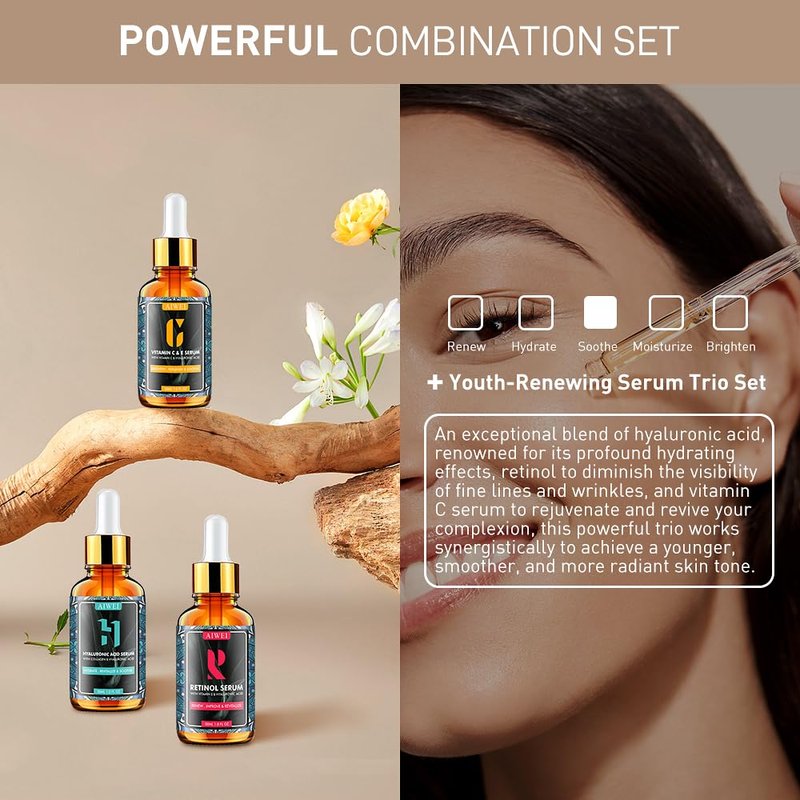 Aiwei Face Serum Set - Includes Vitamin C Serum, Retinol Serum & Hyaluronic Acid Serum - Improve Skin Texture, Glow & Hydration - Day and Night Serums for All Skin Types