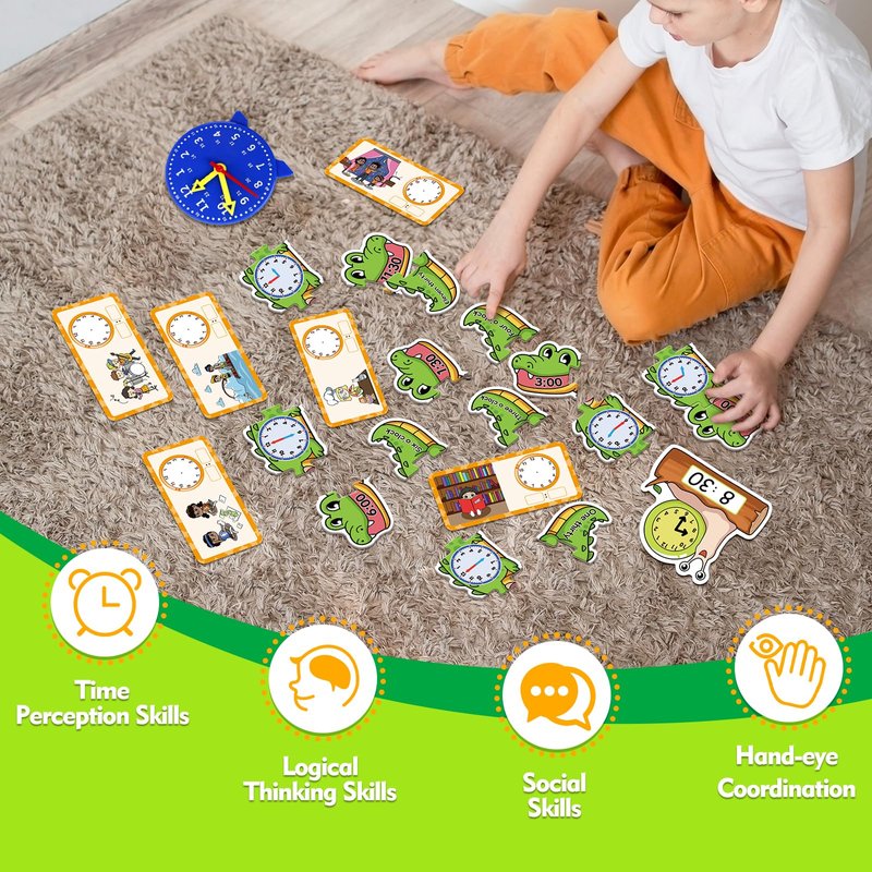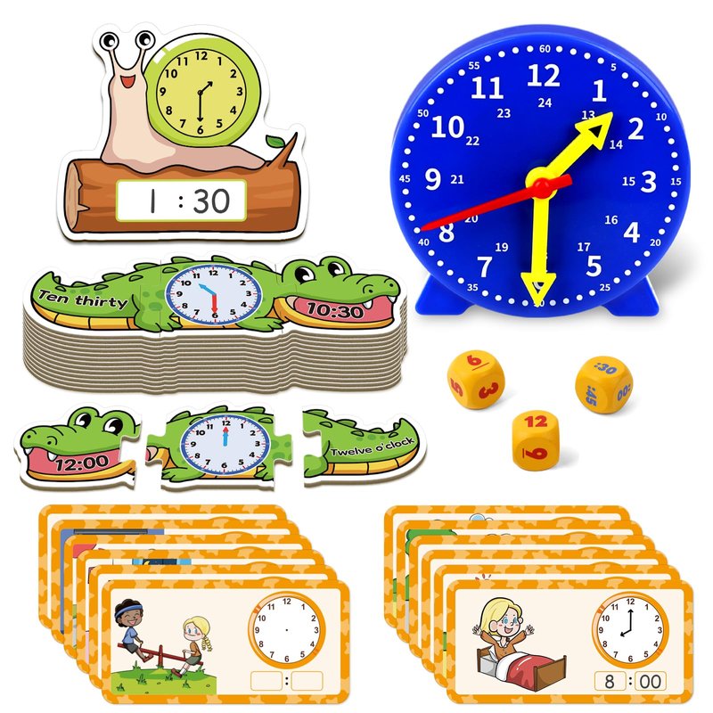 - Clock for Kids: This Time Learning Set is designed for children aged 5 and up. It includes 12 crocodile puzzles, 12 scene cards, a plastic clock, a snail clock card, 3 dice, and a detailed guide, making telling time engaging and fun.
