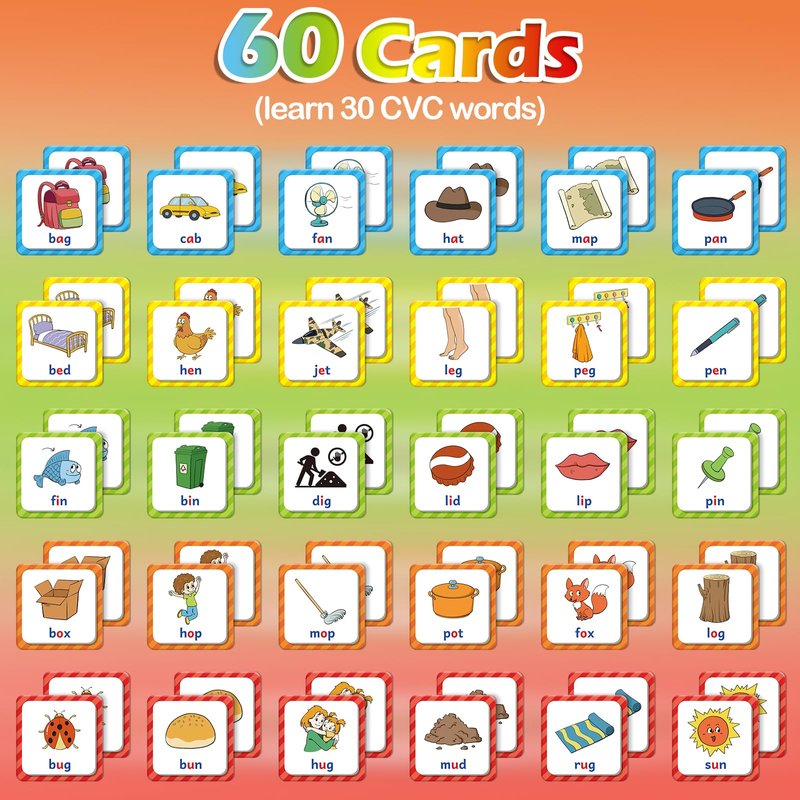 - 【Sharpen Their Memory Skills】Kids learn CVC words every time they turn the cards over. The vibrant colors of this toddler learning toy easily capture kids' attention and stimulate the development of their visual perception skills. It also helps train your little one’s memory, attention span, critical thinking, and hand-eye coordination.