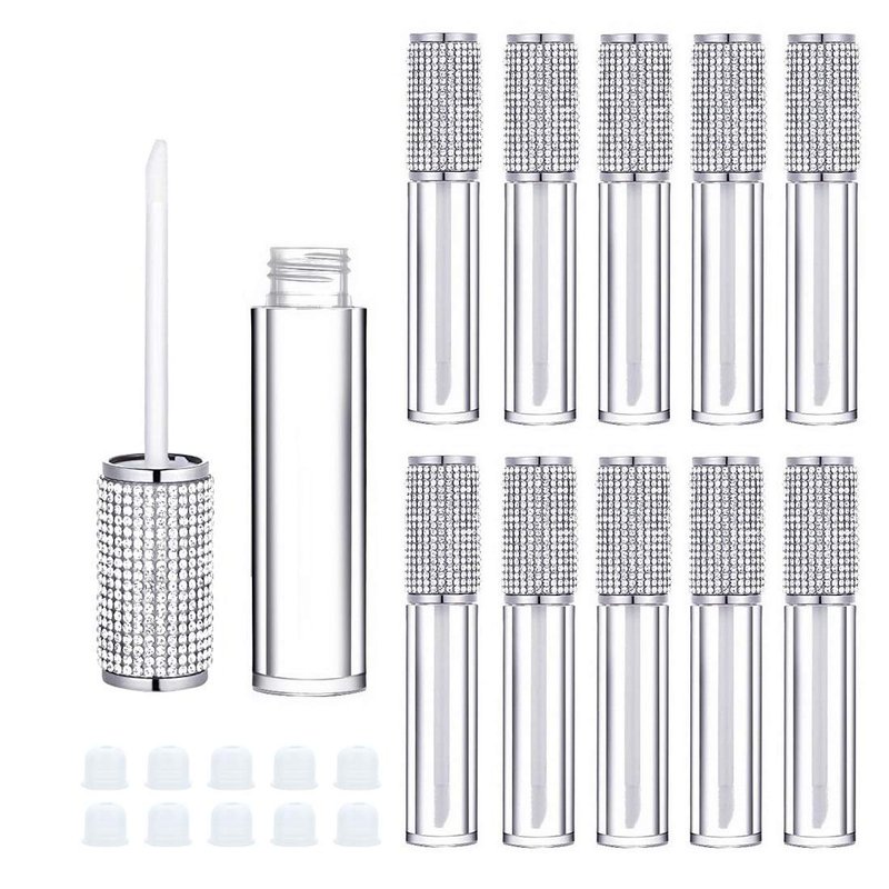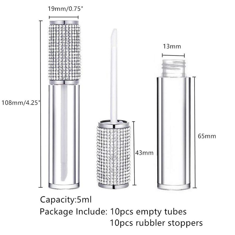 AJLTPA Set of 10 Crystal Rhinestone Lip Gloss Tubes with Rubber Inserts Note:If your rubber stopper is not working, always pop up, please check if the lip gloss is full and there is not enough space to put the wand in. Usage: 1. Clean them by water , DO NOT Boiling Water. 2. Use a funnel or syringe for filling. The trick is to not overfill the container, filling only 4/5 of the way, leaving plenty of room for the stopper and wand. 3. Put the stopper in the bottle. 4. Tighten the bottle cap. SPECIFICATION: Material: AS Color:Silver Diamond Cap Capacity: 5ML Size: Total Length: 108mm/4.25inch Bottom diameter: 19mm/0.75inch PACKAGE INCLUDED: 10 x Empty plastic lipgloss bottle 10 x Rubber stoppers