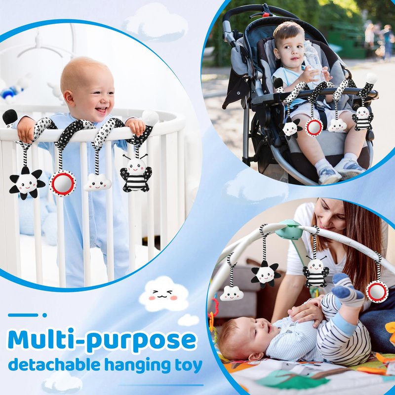 - 【Attractive High Contrast Baby Toys】Our black and white baby car seat toy is specially designed for newborns.It is the great toy for newborn toys 0 3 months brain development.Newborns are born with very blurred vision and can only be sensitive to light. around 0-6 months, they can distinguish high contrast black and white. If you use our black and white baby stroller toy will help to stimulate the development of retina and optic nerve, gradually train and activate your baby's brain development.