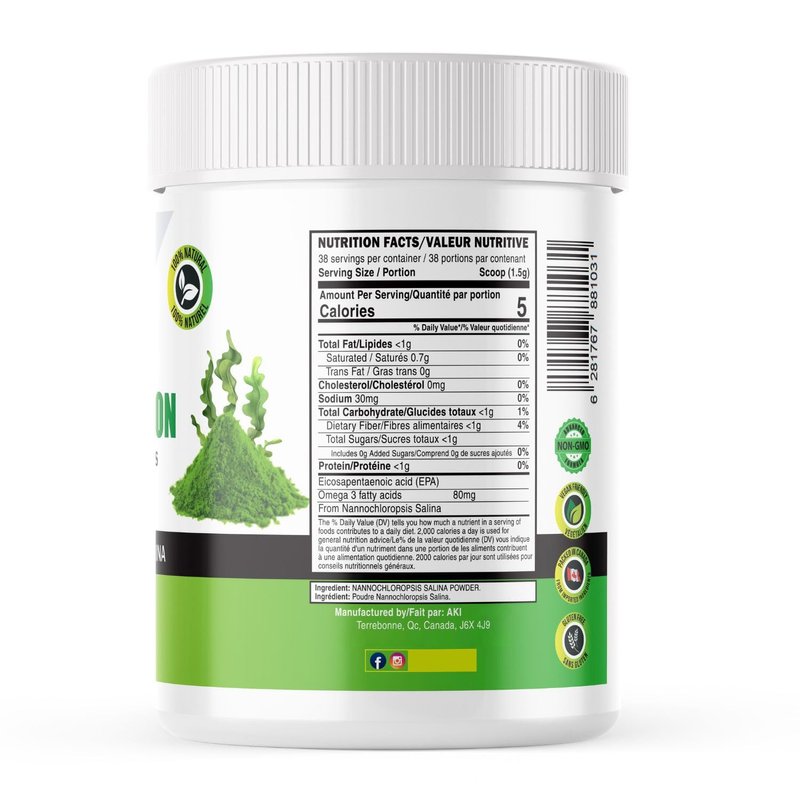 AKI Marine Phytoplankton Powder | Source of Raw Omega-3 EPA Micro Algae Nannochloropsis - Plant Based Proteins, Vitamins for Overall Wellness | Complete Protein Source, Vegan & GMO Free (2 Oz / 57G)