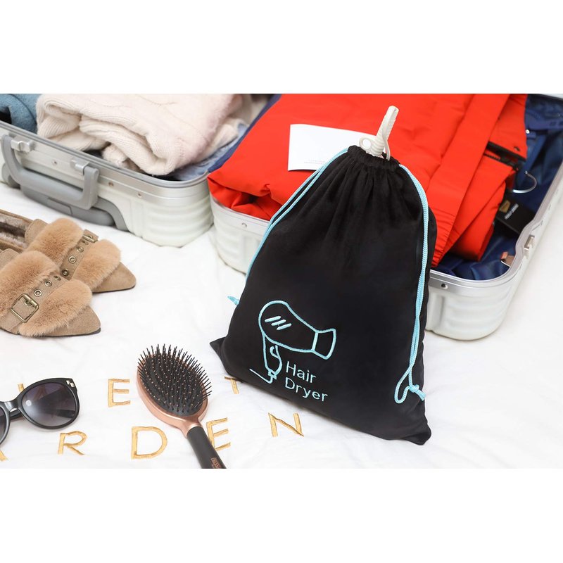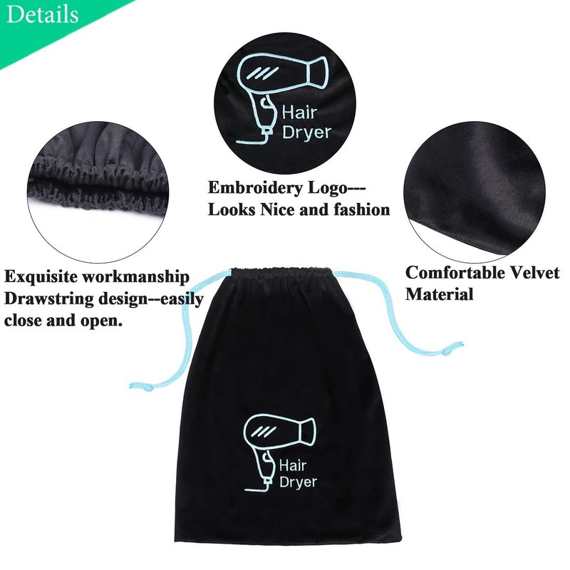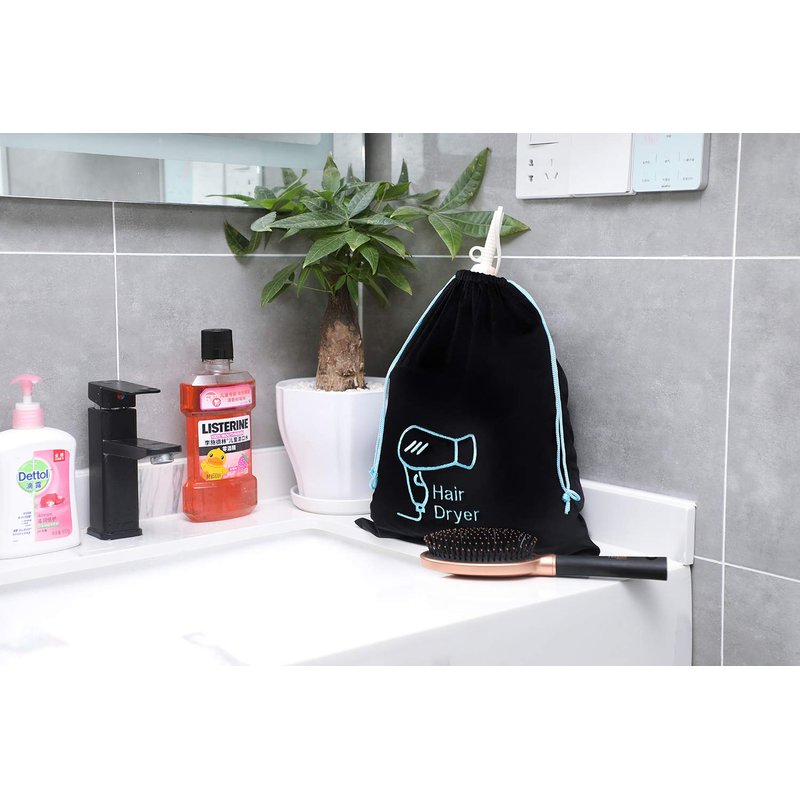 The Hair Dryer Bag helps to protecting hair dryer from dust, dirt and scratches With strong drawstring, makes it open and close easily Proper size for travel use, carry to gym, hotel The hair dryer organizer embroidered with "hair dryer" words, makes it easy for you and the guests to spot them This hair dryer travel bag suitable for many of your hair styling or makeup accessories