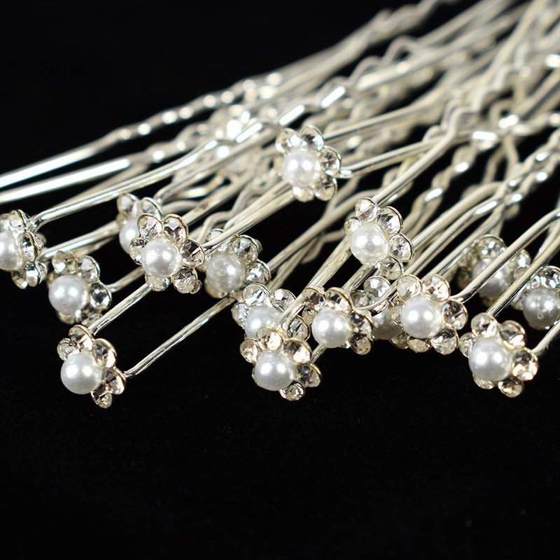 AKOAK 40 Pcs Bride Diamond Pearl Flower Tiara Wedding Bridesmaid Pearl Flower Hair Pin Delicate and Elegant Female U-pin Metal Hair Fork for Women's Hair Jewelry