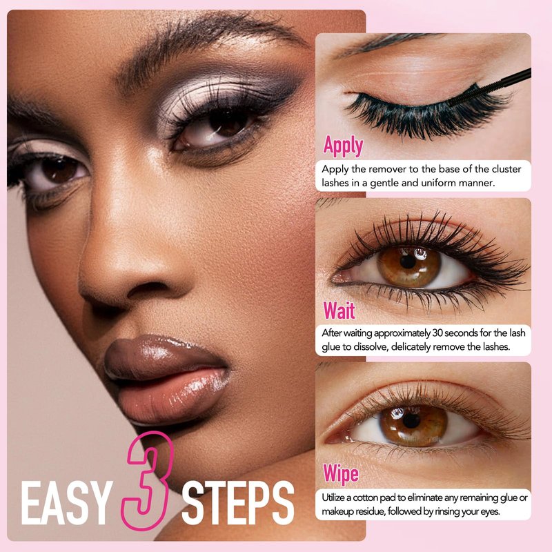 - SIMPLE USAGE: Begin by applying the lash bond and seal remover directly to the base of your cluster lashes, ensuring thorough coverage. Let it sit for 30 seconds to allow the eyelash glue to dissolve effectively. Then, gently use a cotton swab or mascara brush to brush off the clusters for complete removal. Finish by rinsing your lashes meticulously with lash cleanser and water for a clean and refreshed look.