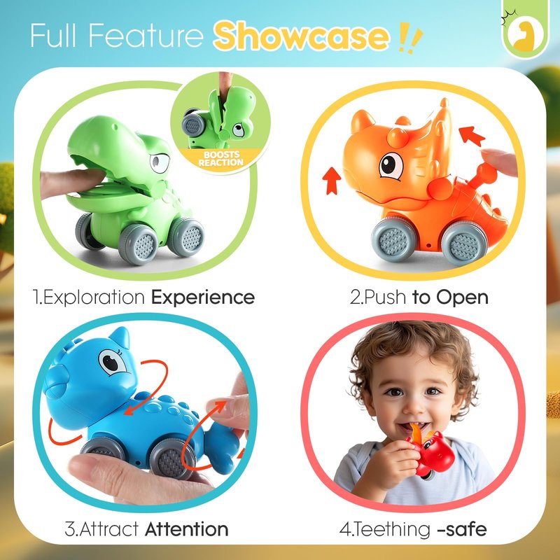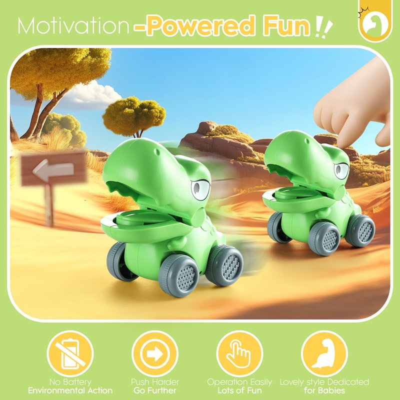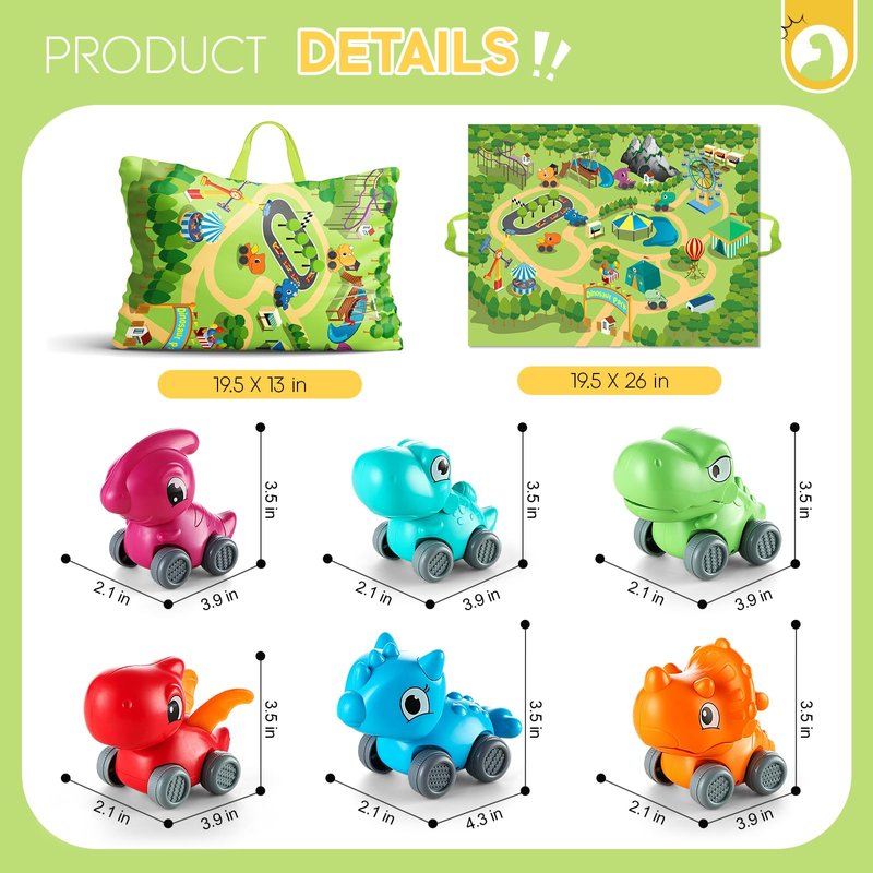 This is a 6 pcs dinosaur car toys set that can be enjoyed by babies & toddlers.All the car toys are in bright colors, round edge design, no sharp parts,no small parts.Babies could push the friction car forward and watch it as they cover long distances - no batteries needed! The car toy sets are well packaged(using open-box design)and good quality,they will be a lovely gift for toddlers who love trucks!