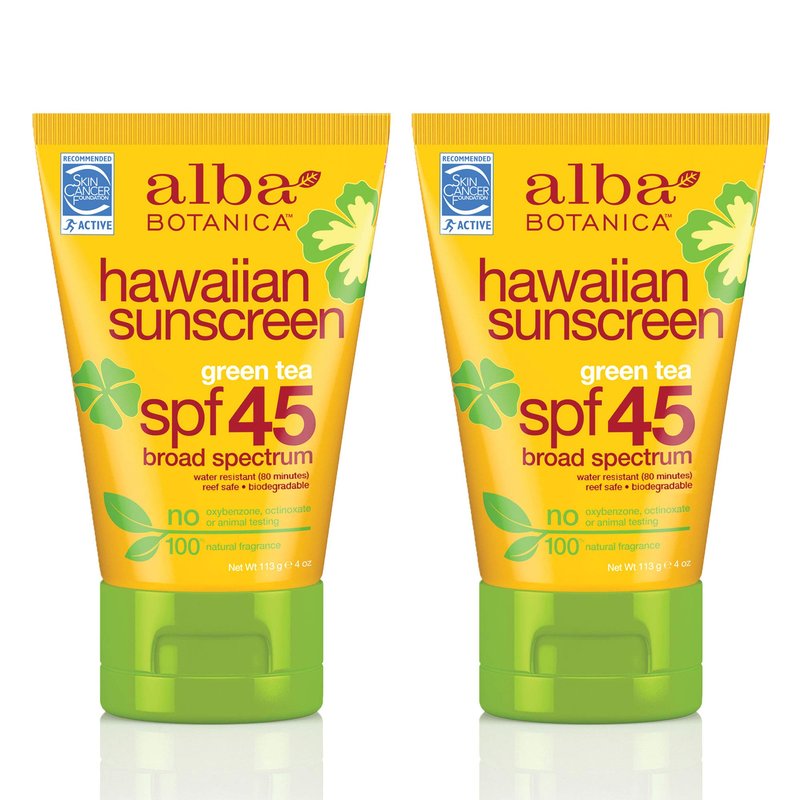 - Two 4 oz. tubes of Alba Botanica Green Tea Hawaiian SPF 45 Sunscreen