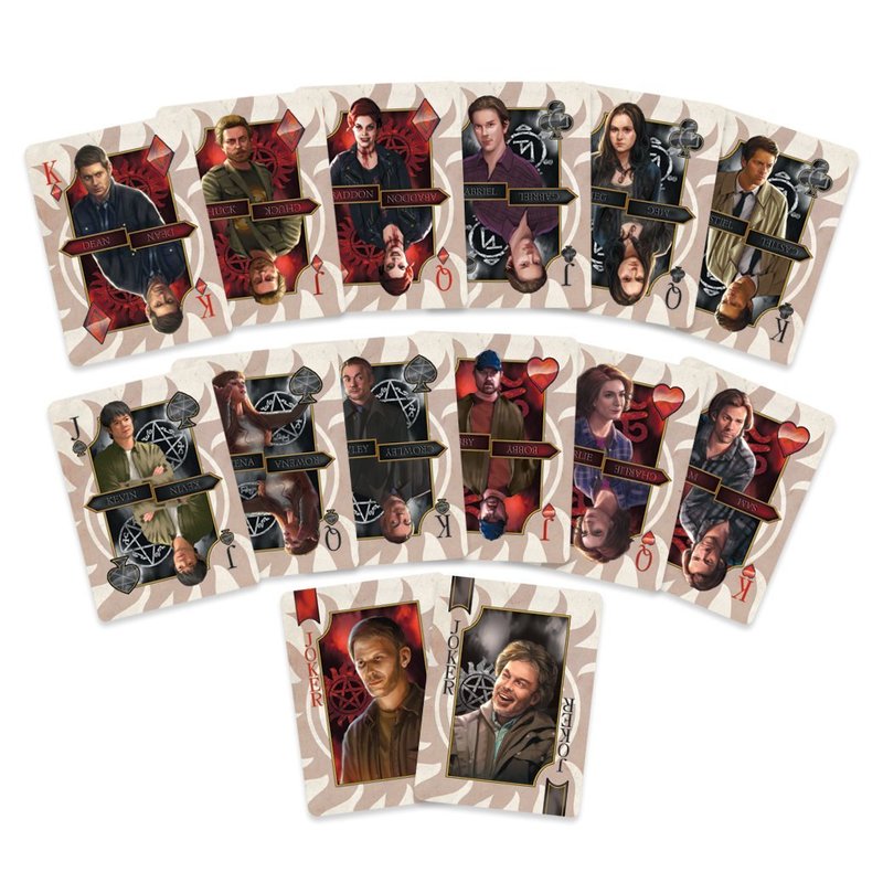 An officially licensed deck of Supernatural playing cards and matching collectible coin are now available. A custom deck of unique playing cards based on Supernatural. This deck contains 54 custom cards featuring unique court cards, gaffs, and jokers bring Supernatural to life right in your hand. Please note that this is a brand new deck, but is not wrapped in cellophane.